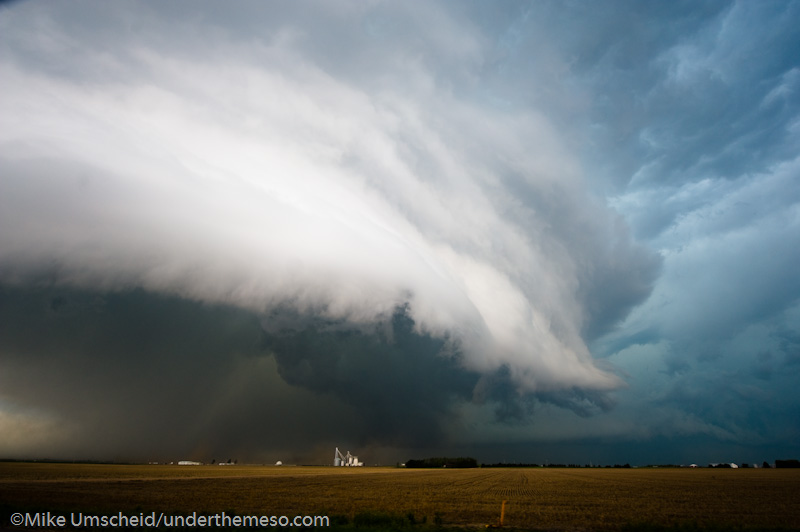When I reached Hwy 83, I was greeted to a massive updraft area to my southwest. Tornado warnings were issued for storms farther north in the Leoti area. It turned out that there was a small cluster of non-supercell, landspout tornadoes. Oh well. I drove north on Hwy 83 to Shallow Water when the storm to my southwest was wrapping up significantly. This was turning into an HP beast, and I found myself in the notch of this thing. I got out of the car to take a few images, but I couldn’t do that long, as this storm was racing northeast at 50 mph.