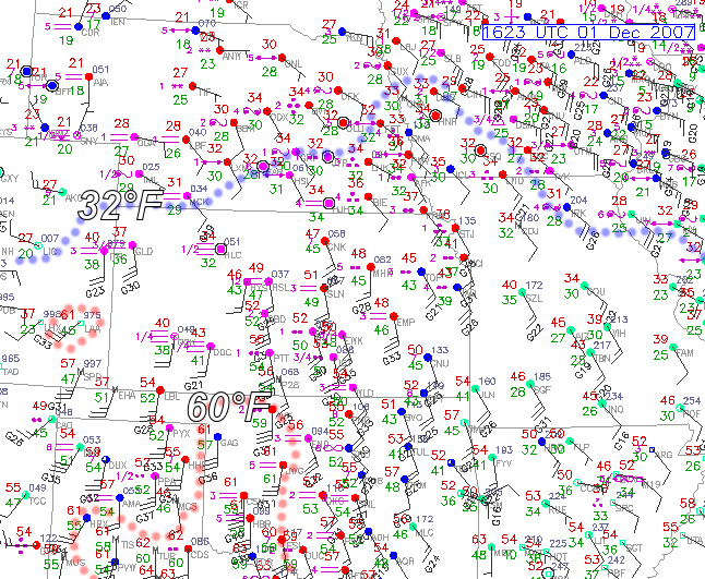 So much for appreciable precipitation in SW Kansas. Well, it’s now late morning amidst dense fog here in Dodge City, as surface moisture has rapidly surged north into the remnant shallow cold airmass. The freezing line has shifted way north into Nebraska by now. We observed very light freezing rain and freezing drizzle here in Dodge City from roughly 3:30-6:30am. Total precipitation measured at the airport (from the ASOS) was a whopping 0.01". Up at Hays, it looks like only 0.03" was measured at the AWOS station. Hays went above freezing at roughly 5:30am, several hours sooner than thought. The warm, moist air really surged north rapidly this morning. There were pretty much no impacts across this area from freezing precipitation, as a result. Now we wait on the wind… we’ll see how this aspect of the storm verifies. I was expecting far southwest KS to see some 60 mph gusts later on this afternoon. Now, the real winner (or loser) of this storm from the winter precipitation aspect is Iowa into adjacent southern Minnesota. Major icing going on now across Central Iowa from what it looks like per obs and radar. Here is the Nowcast Thread on Stormtrack forum from other storm chasers and genuine weather weenies talking about that. Back to the high plains region, It’s already 60°F in Lamar, CO from the downslope. Below is the 16z (10am CST) surface chart: