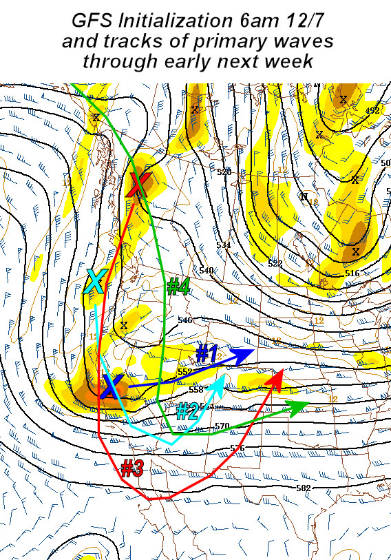 Img 1Freezing drizzle to develop later tonight.  Current surface map shown in Img 1, as of 17z (11 am), revealed cold airmass in place across pretty much all of Kansas now as of midday today.  Currently sitting at 32 degrees here in Dodge, and we will be lucky to rise 3 or 4 more degrees.  By evening, low level winds just off the surface will increase out of the south and southeast, creating necessary lift for drizzle formation.   Img 2The best layer to see this is between 900 and 850mb for a Dodge City elevation; I like using 875mb from the NAM model to see this shallow near-surface layer forcing (shown in Img 2).  A nice thermal boundary will be just southeast of Dodge with completely saturated air.  This is about the time I go in to work tomorrow morning, so I hope the roads won’t be too bad.  Saturday night and beyond, it still looks like a complicated mess, as no less than 4 short-wave disturbances will rotate through a mean larger-scale trough across the Southwest (Img 3).  Needless to say, it’s a complicated forecast as each of these waves will have an impact upon each other in how they grow/interact as they evolve through the trough.