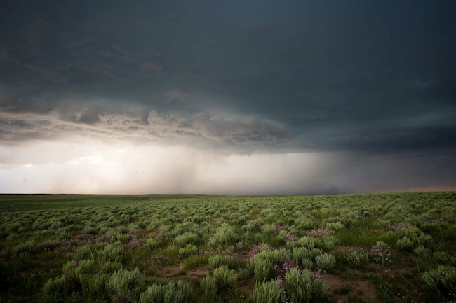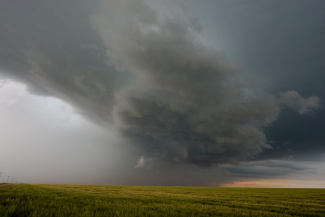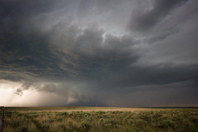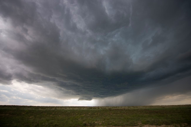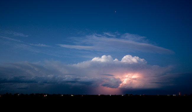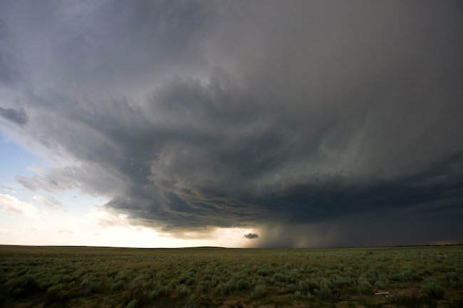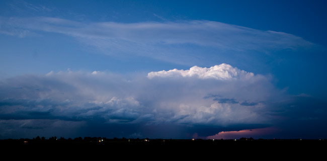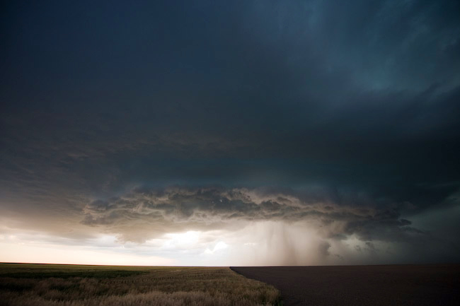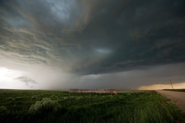 It didn’t take long for storms to initate along the Hwy 24 corridor southwest of Limon, which is the classic initation point for Palmer Divide storms.  We drove to Hugo, CO where we refueled and on our way.  Our target storm started getting better organized west of Hugo on our approach to Hwy 71.  From there we followed the high-based supercell southeast following Hwy 94 to Wild Horse.  At one of our stopping points along Hwy 94, we ran into a huge conglomeration of small gnats.  We think a small mesoscale boundary/wind shift brought these bugs in, because they just hit us without warning.  They were everywhere inside the Jeep, so it took the remainder of the chase to try and get rid of all these distracting gnats!  Anyway, the storm was largely outflow dominant as we followed it south and east from Aroya to Eads.  At one point, the structure of the supercell revealed a nice barrel shape to it.  Once we reached Eads, we actually drove south about 7 miles or so to try and get well south of the storm to see if we could observe more interesting cumulonimbus structure from afar.  Unfortunately, this didn’t work out so well so we drove back north to Eads then continued east on Hwy 96 toward Sheridan Lake.  The supercell had a rather steady-state outflow dominant structure its whole life, but it was pretty.  It was a challenge to shoot the storm against a very luminous backdrop.  Contrasts were harsh quite often, so I tried to shoot more structure looking north or north-northwest where there wasn’t an 8-stop luminosity difference between the dark storm and the really bright backdrop behind the storm.  We followed the storm on some farm roads southeast of Sheridan Lake until it got too dark and the storm was slowly weakening.  One last photography shoot location was along Hwy 50 where we finally got a good glimpse of the cumulonimbus top from a distance.  Occasional cloud-to-ground lightning illuminated some structure — even a lowering — as the storm moved away from us into Hamilton County, KS.