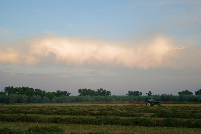 This was a bust.  No storms developed in the target area.  I actually had two target areas, and even the secondary target area failed to produce a supercell storm… so I’m really not all that disappointed.  My primary target was the slowly moving front across Central Nebraska.  A couple versions of the NAM and even RUC models hinted at possible convective initiation along the boundary in central Nebraska, and per model soundings, if surface temperatures reached 95 degrees up along this front, there would be a shot.  Well, the warmest temperatures I saw on obs as well as per my car’s thermometer, the temperature in the vicinity of maximum convergence along the front never got much above 91 or 92.  The mid level temperatures were simply too warm.  When the cumulus looked at flat as they did for so late in the afternoon, I knew I was in trouble, and it would take a miracle for something to grow into substantial, hard towers and even further into a storm.  The cumulus field did become a little agitated by 5:30 to 6:30pm where I was sitting at southeast of Minden, Nebraska, but it never got beyond that point.  At 7:30pm, I called it quits and headed west toward McCook to set up for Day-2.  Below is one photo I did take of some high level virga that crossed the area around sunset: