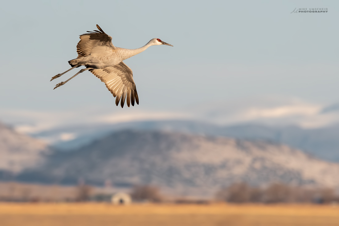 Sandhill Crane coming in for a landing to begin its day of foraging at Monte Vista NWR, Colorado. 9 March 2020